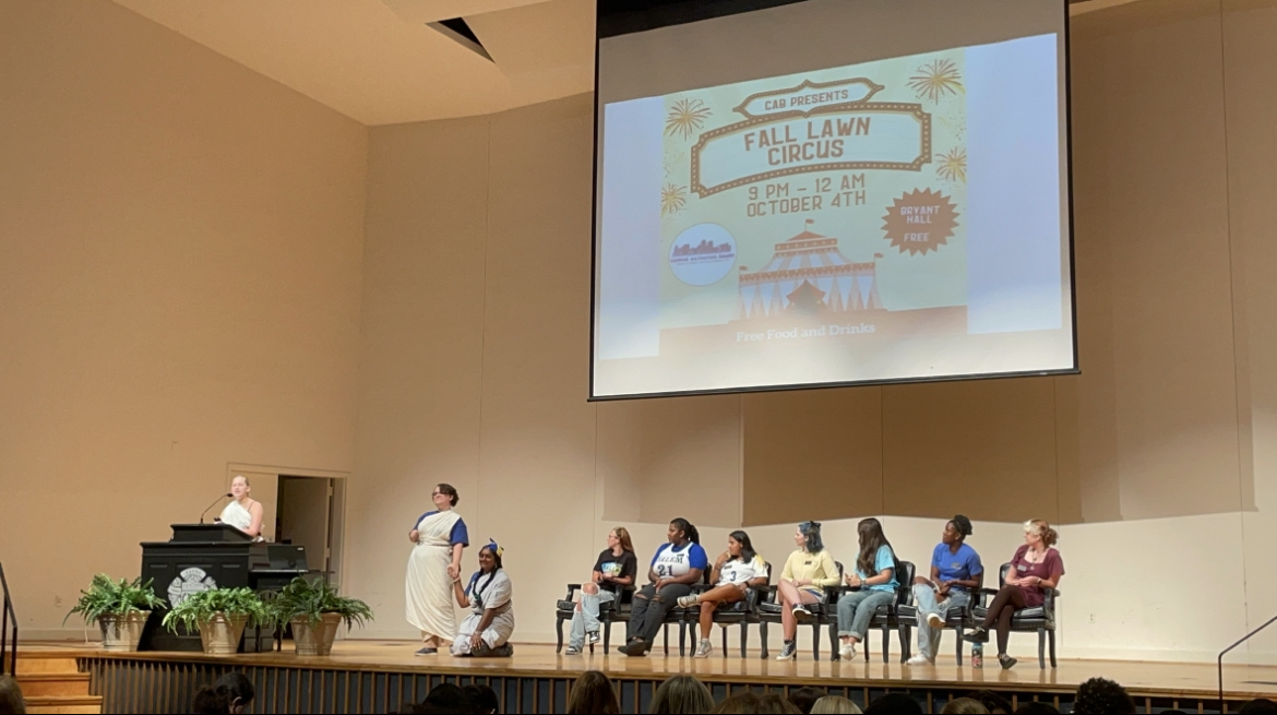 As is tradition, there has to be at least one skit at a Salem College town hall. Wearing homemade togas and hats of sorts, a gaggle of Pierrettes including Venus Radoslovich, Faith Meadows, Sam George, and Alex Angelini, showcased a riveting performance as they hinted at the theme of the fall play. The Salem community roared with applause and cheers as Venus burst onto stage and massacred their fellow board members, announcing triumphantly the title of the fall play: Medea! For more information on the fall play, including showtimes and ticket prices, keep a look out for an email from The Pierrette’s board. You can also check out their Instagram: @pierrette.players