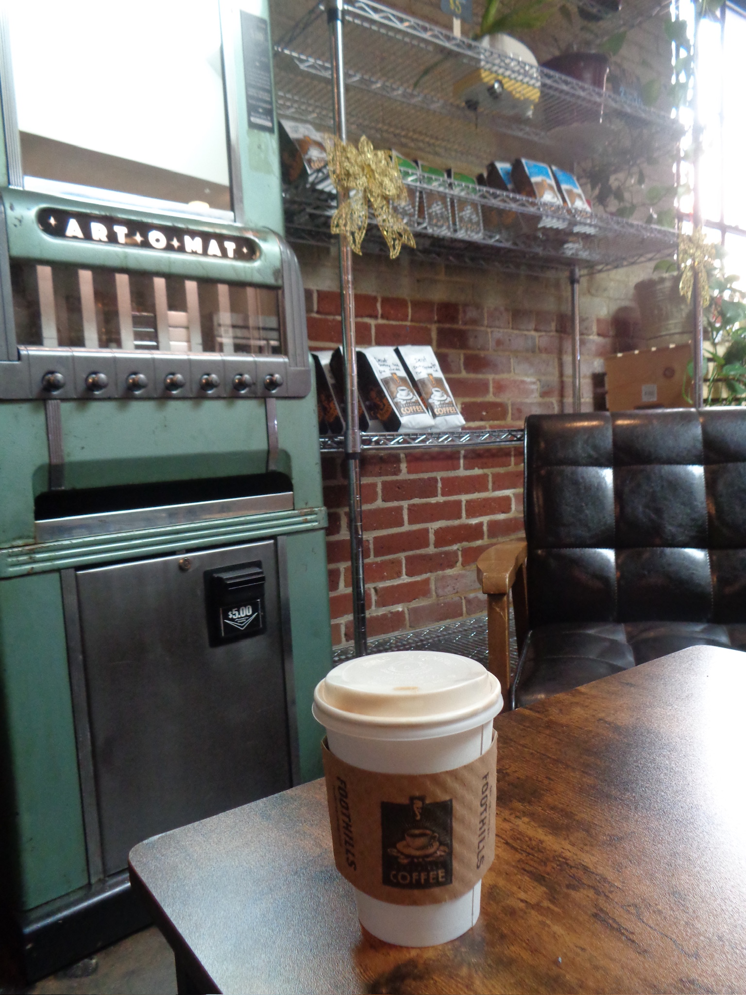 - Ambiance: I was lucky to get there when I did, because there was limited seating at Footnote. I don’t think Footnote is one of those coffee shops where people mingle over long periods of time- it’s maybe more of a grab and go type situation. But, I did manage to get a seat by the door and an Art-O-Mat! Art-O-Mats are one of Winston-Salem’s delightful little treasures, scattered and hidden about the city like a magpie’s treasure. Art-O-Mats are old cigarette machines that have been converted into local artisan vending machines. For only five dollars, you can get a one of a kind custom print from a local printmaker, or maybe even some custom made jewelry?! Very cool. Very swag. Besides the Art-O-Mat, Footnote had a nice atmosphere. I like that Footnote is hidden from 4th Street, it’s quieter this way. The quietness gave me the opportunity to focus on the beautiful tunes that were being played in the background. Whichever barista was on aux today, thank you. Let me just list out a few of the songs that were played during my hour of leisure at Footnote today: