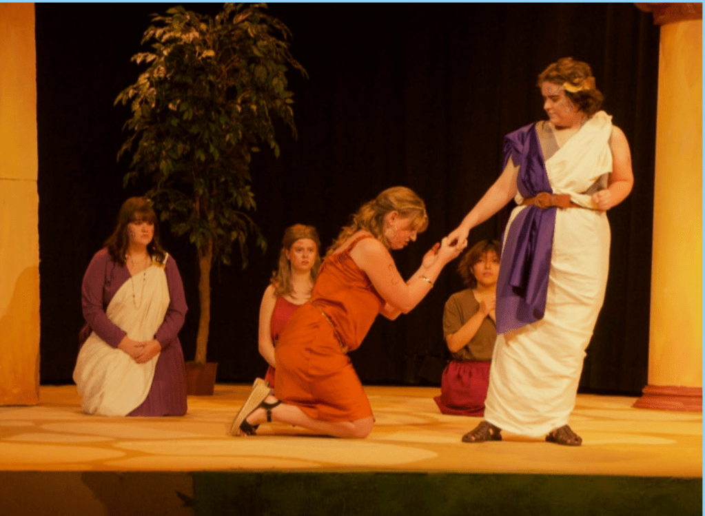 The role of the cunning and calculated Medea was given to a first-year student, the talented and passionate Molly Togni. Molly took a head-on approach to the unapologetically mad woman trope, and stunned the crowd with her well-projected voice, and animated expressions. The playboy in question, Medea’s Husband Jason, was played by the star-to-be, Emma De Noble. Emma took the stage with an organic and natural form of acting. As the supporting lead, she embodied the character wonderfully, and her lines seemed to flow from within. Those who did not lead in the play still had a great amount of lines and story to share. The other roles included Alex Angelini who played the role of the wise King Creon with great candor and spirit. The Nurse was played by Faith Meadows, whose persuasions and pleas rang bitterly as the story unfolded. The eager Messenger was played earnestly by Izzie Menius. The friendly and kind Aegeus who offered Medea asylum in his kingdom, was played by Gisselle Garcia-Vazquez. The warm and insightful Tutor was played by Maureen White. Medea’s innocent but doomed children were played by Artem Watson, and Ren Wolf. Lastly, the haunting part of the Chorus who sang warnings to Medea all in sync was played by Lillian Allen, Giselle Garcia-Vazquez, Maureen White, and Faith Meadows.