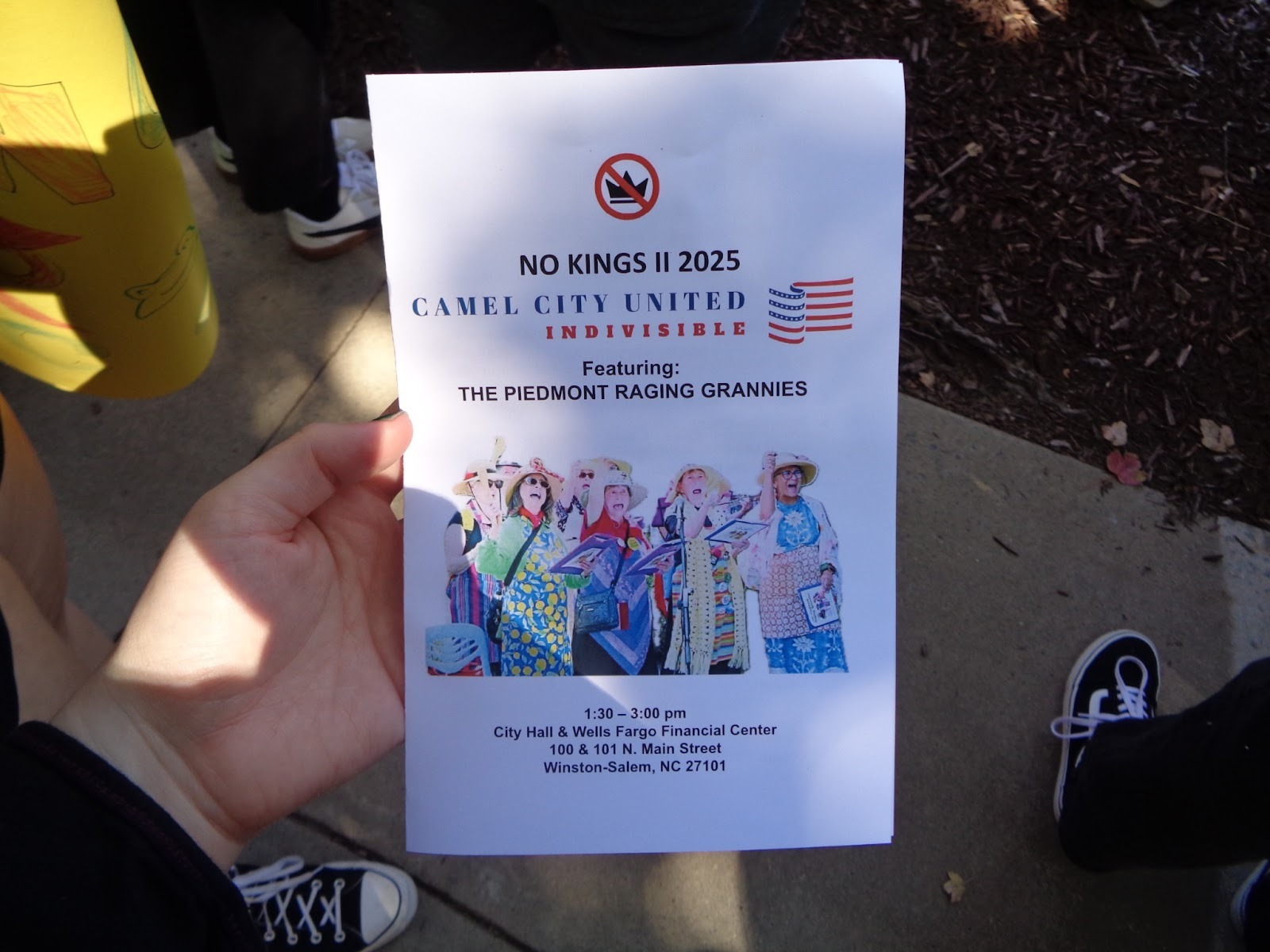 The No Kings Protest in downtown Winston-Salem was held in partnership with the musical group, Piedmont Raging Grannies, as well as an impressive lineup featuring several local officials, including Reverend Richard Sigler, Kimberlee Biondi from Red, Wine & Blue, Lewisville Mayoral Candidate Bill Carter, organizing director for AFT North Carolina Jennifer Mangrum, and NAACP Education Coordinator Ronda Mays.