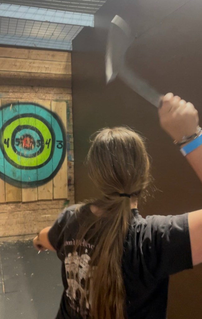Each ax I threw struck the wood with a satisfying thunk, imbedding itself deep in the crevices of the boards. They landed exactly where I intended them to, and every throw I made released some of the stress I had carried with me for so long.