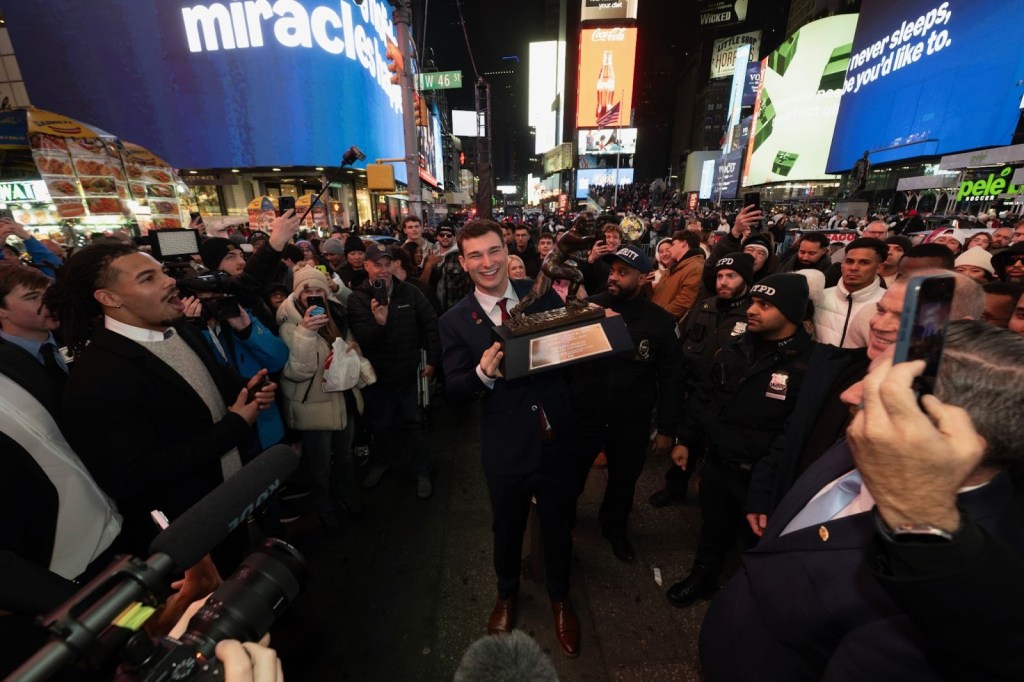 Fernando Mendoza holds the Heisman Trophy in Times Square