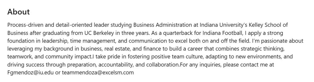 In just a sentence, he listed his status as a student and athlete at Indiana University and his degree from Berkeley University. It is direct and summarizes his education and current position at Indiana. When building your profile, follow Mendoza’s lead and showcase who you are in your headline.