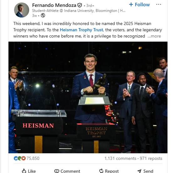 On Dec. 13, 2025, Fernando Mendoza, quarterback for Indiana University, became the 91st winner of the coveted Heisman Memorial Trophy. Though you likely aren’t the projected #1 pick in the NFL draft, I’m sure you and Mendoza share something in common: LinkedIn. According to “Fox Sports’” 2025 article “Career Update: Fernando Mendoza Posts Heisman Win,” Mendoza is receiving lots of media attention surrounding his frequent use of LinkedIn. During the college football season, LinkedIn is the only form of social media he keeps on his phone to keep himself focused on his academics and team. His well-developed profile showcases his brand deals, awards, and many internships. After receiving the Heisman trophy, he took to LinkedIn to celebrate his win and thank voters.