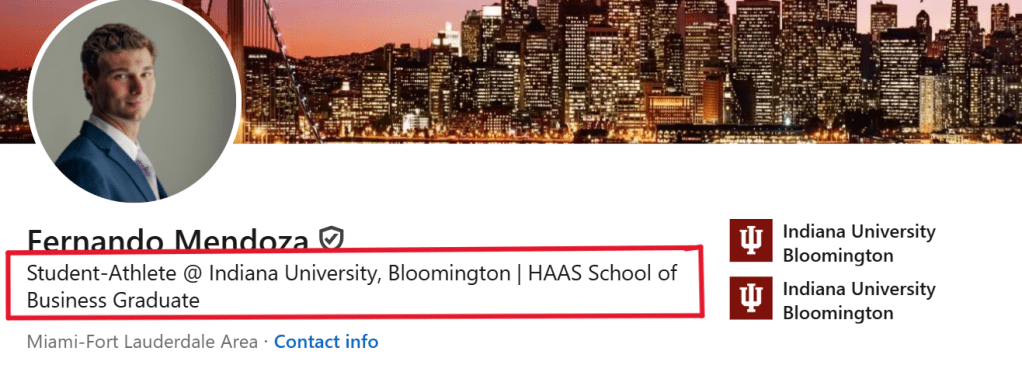 Mendoza’s headline reads: “Student-Athlete @ Indiana University, Bloomington | HAAS School of Business Graduate.”
